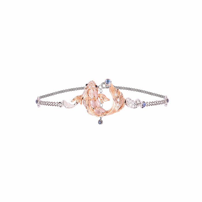 Made of 18K gold and 18K white gold, Burmese Ice Jadeite, Moonstone, Black agate, and Diamond.