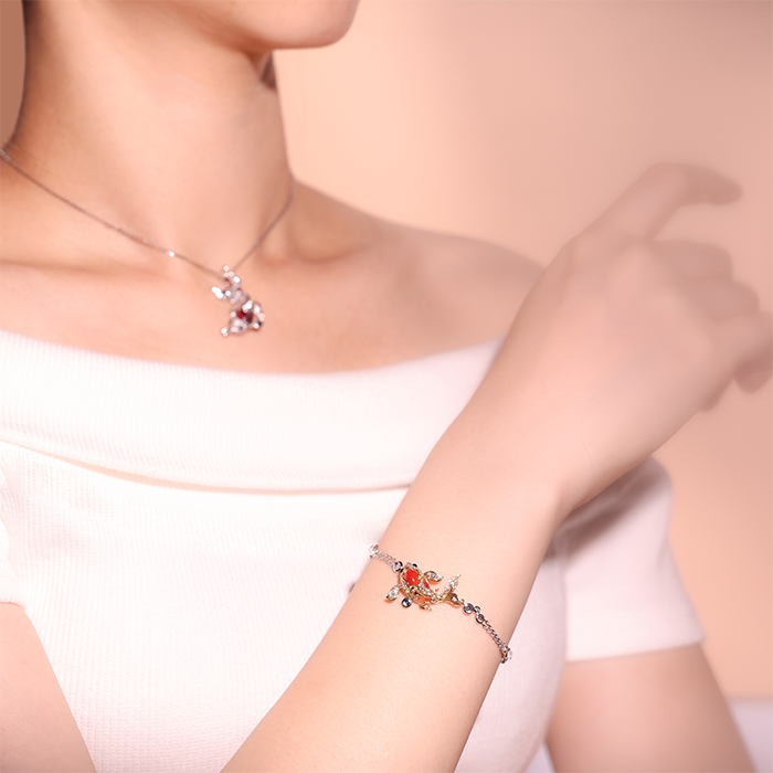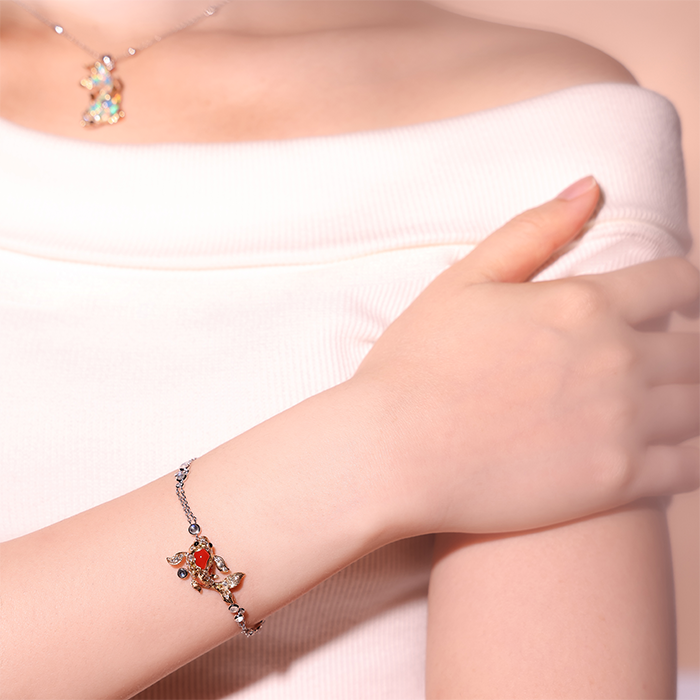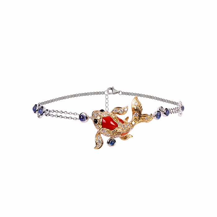 Made of 18K gold and 18K white gold, Coral, Moonstone, Yellow Diamond, Black Agate, and Diamond.