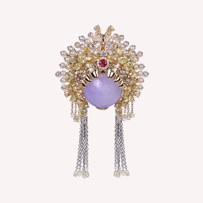 Made of 18K gold and 18K white gold, Burmese Purple Jadeite, Japanese Pearl, Ruby, Sapphire, Yellow Diamond, Pear Cut Diamond, and Diamond. Convertible brooch, pendant and Earrings.