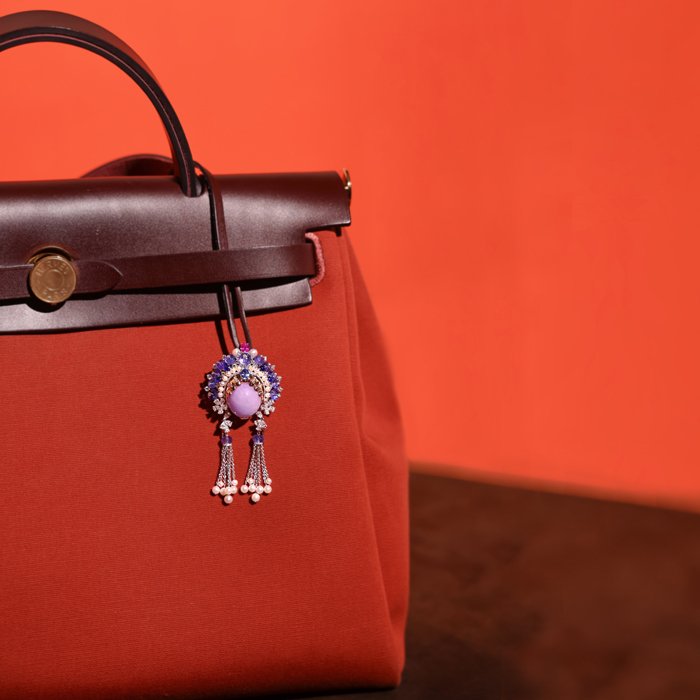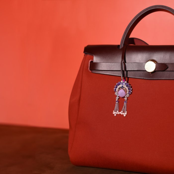 Made of 18K gold and 18K white gold, Burmese Purple Jadeite, Japanese Pearl, Ruby, Sapphire, Sapphire, Tanzanite, Pear Cut Diamond, and Diamond.