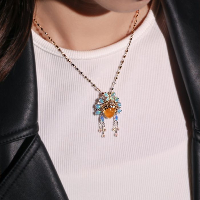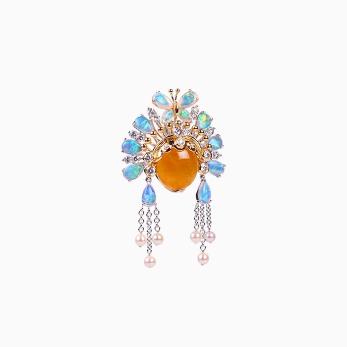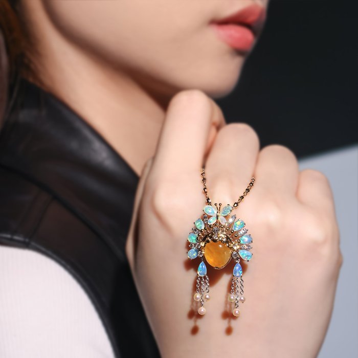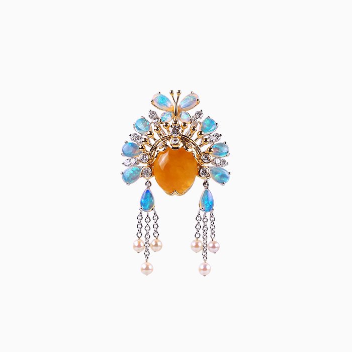 Made of 18K gold and white gold, Burmese Yellow Jadeite, Japanese Pearl, Opal, and Diamond. Convertible brooch and pendant. ・Limited Mini LianPu collection № 55