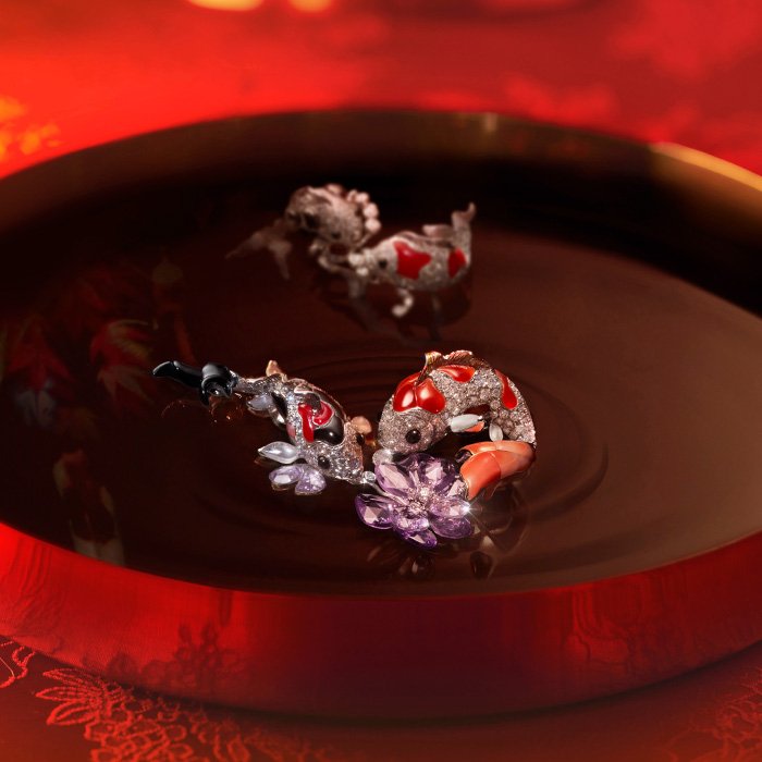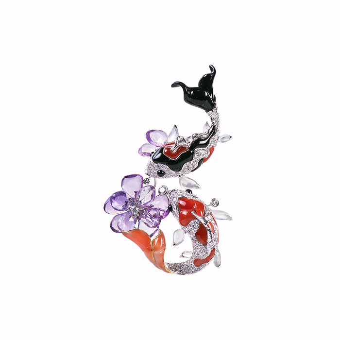 Made of 18K white gold, Colored Corundum, Coral, Ice Jadeite, Black Agate, and Diamond. Convertible brooch and pendant.
