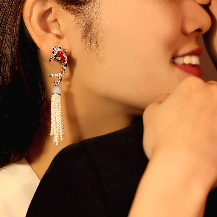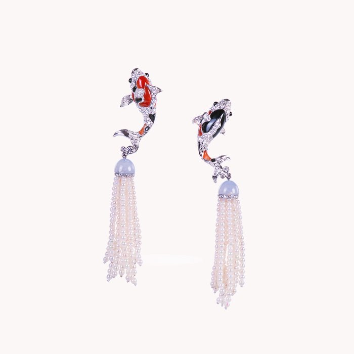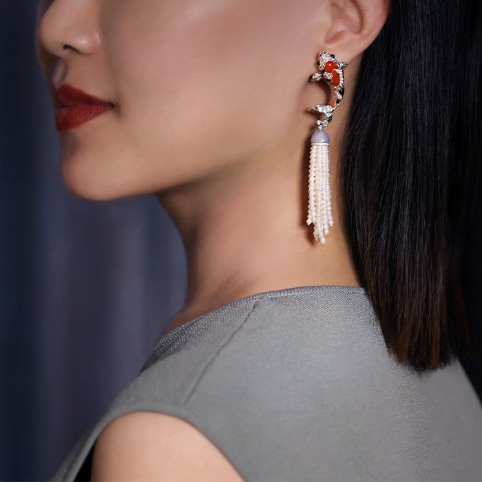 Made of 18K white gold, Coral, Japanese Pearl, Blue Chalcedony, Black Agate, and Diamond.