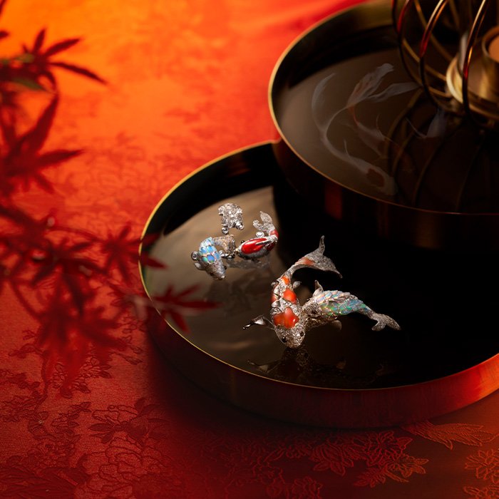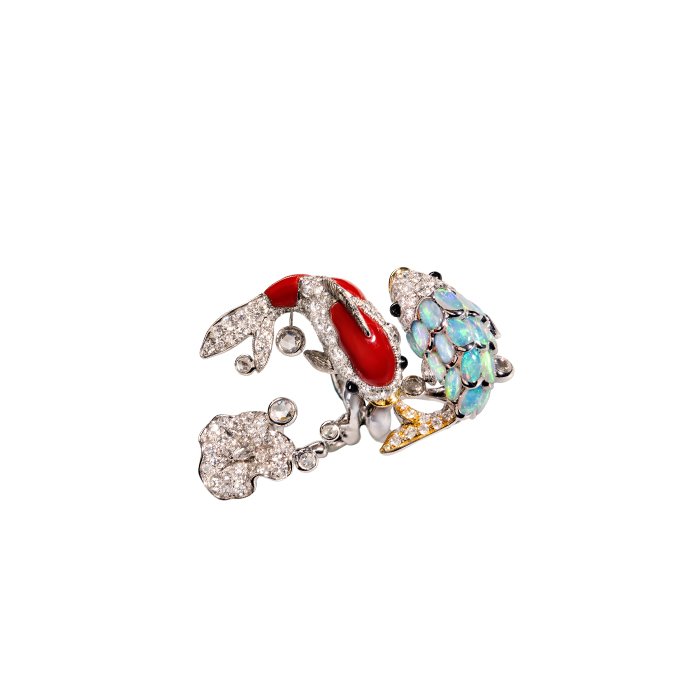 Made of 18K gold and 18K white gold, Coral, Opal, Yellow Diamond, Pear Shaped Rose Cut Diamond, Brilliant Cut Diamond, Black Agate, and Diamond.