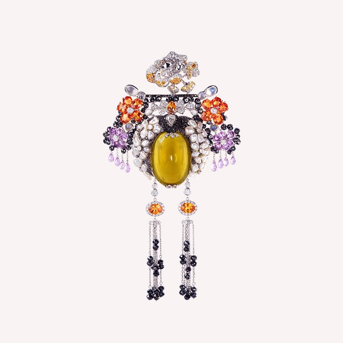 Made of 18K white gold, Lemon Chrysoberyl, Keshi Pearl, Corundum, Colored Corundum, Moonstone, Colored Diamond, Yellow Diamond, Black Diamond, Pear Cut Diamond, and Diamond. Convertible brooch and pendant.