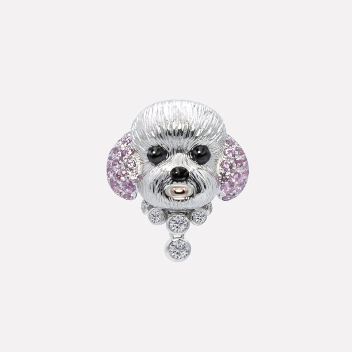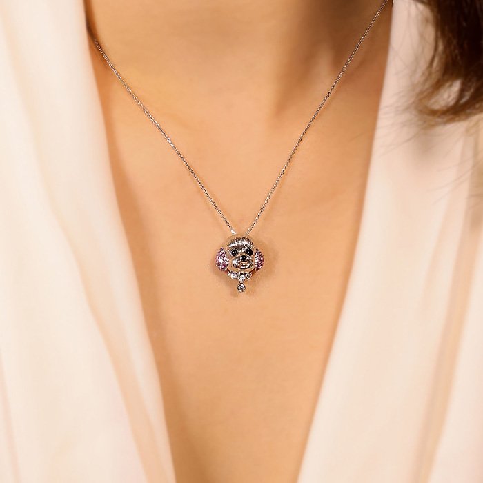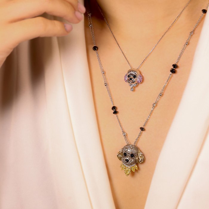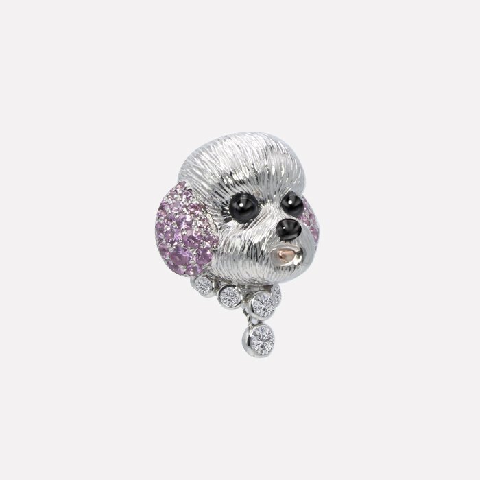 Pink Sapphire Diamond Pendant Made of 18K white gold, Pink Sapphire, Enamel, Black Agate, and Diamond.