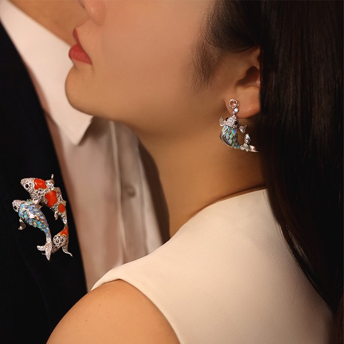Made of 18K white gold, Opal, Rose Cut Diamond, Black agate, and Diamond.