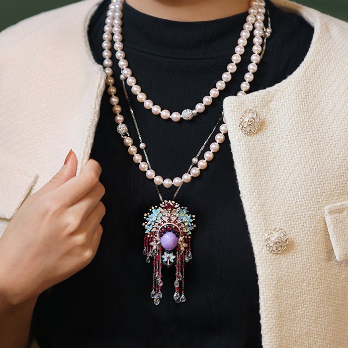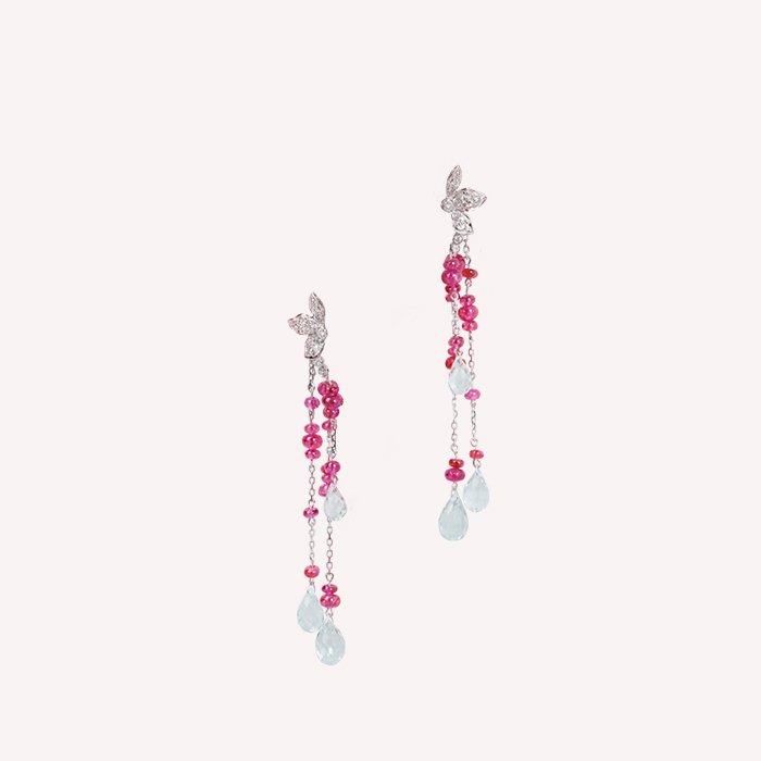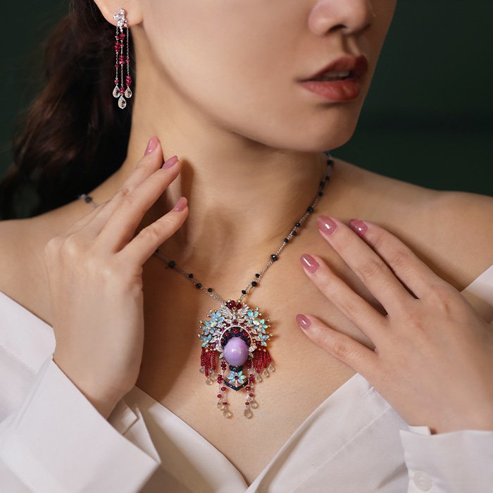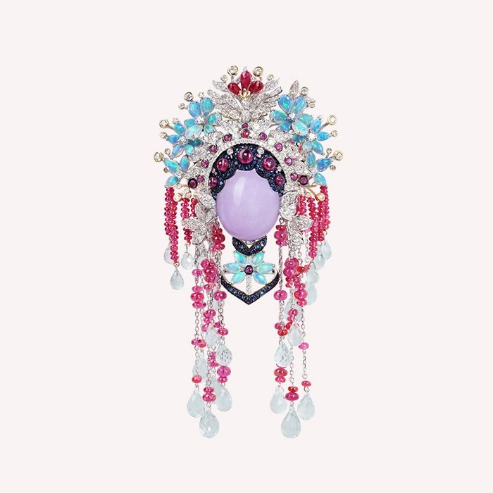 Made of 18K white gold, Purple Jadeite, Ruby, Sapphire, Opal, Aquamarine, and Diamond. Convertible brooch and pendant. Convertible brooch, pendant and Earrings.