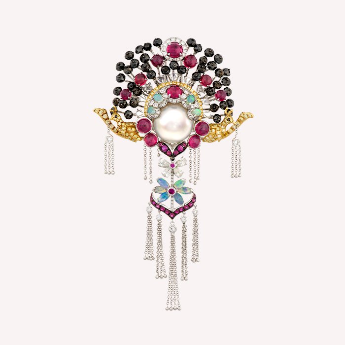 Made of 18K gold and 18K white gold, South Sea Pearl, Ruby, Pink Sapphire, Opal, Moonstone, Tourmaline, Black Diamond, Yellow Diamond, Pear Cut Diamond, and Diamond. Convertible brooch and pendant.