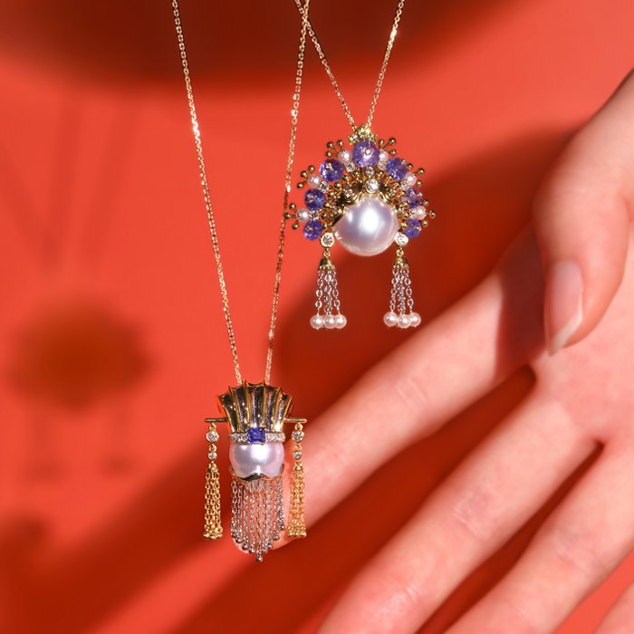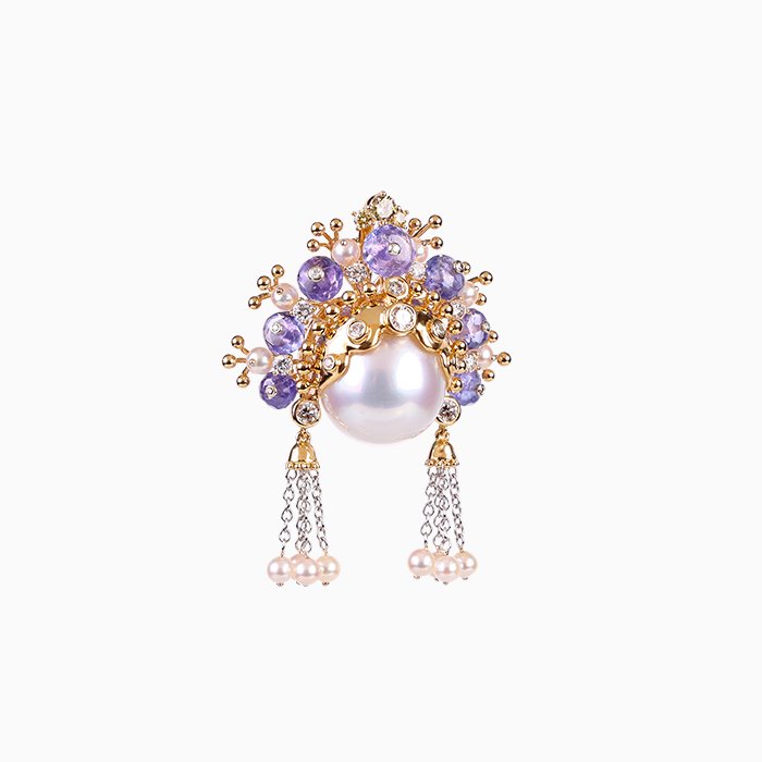 Made of 18K gold and 18K white gold, South Sea Pearl, Japanese Pearl, Tanzanite, Yellow Diamond, and Diamond. Convertible brooch and pendant. ・Limited Mini LianPu collection № 63