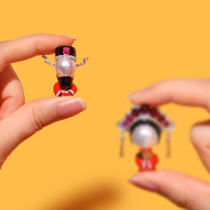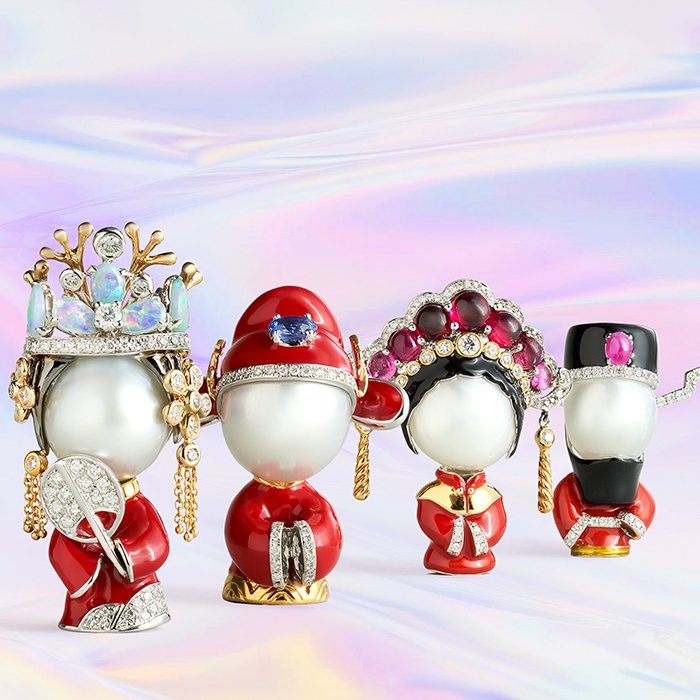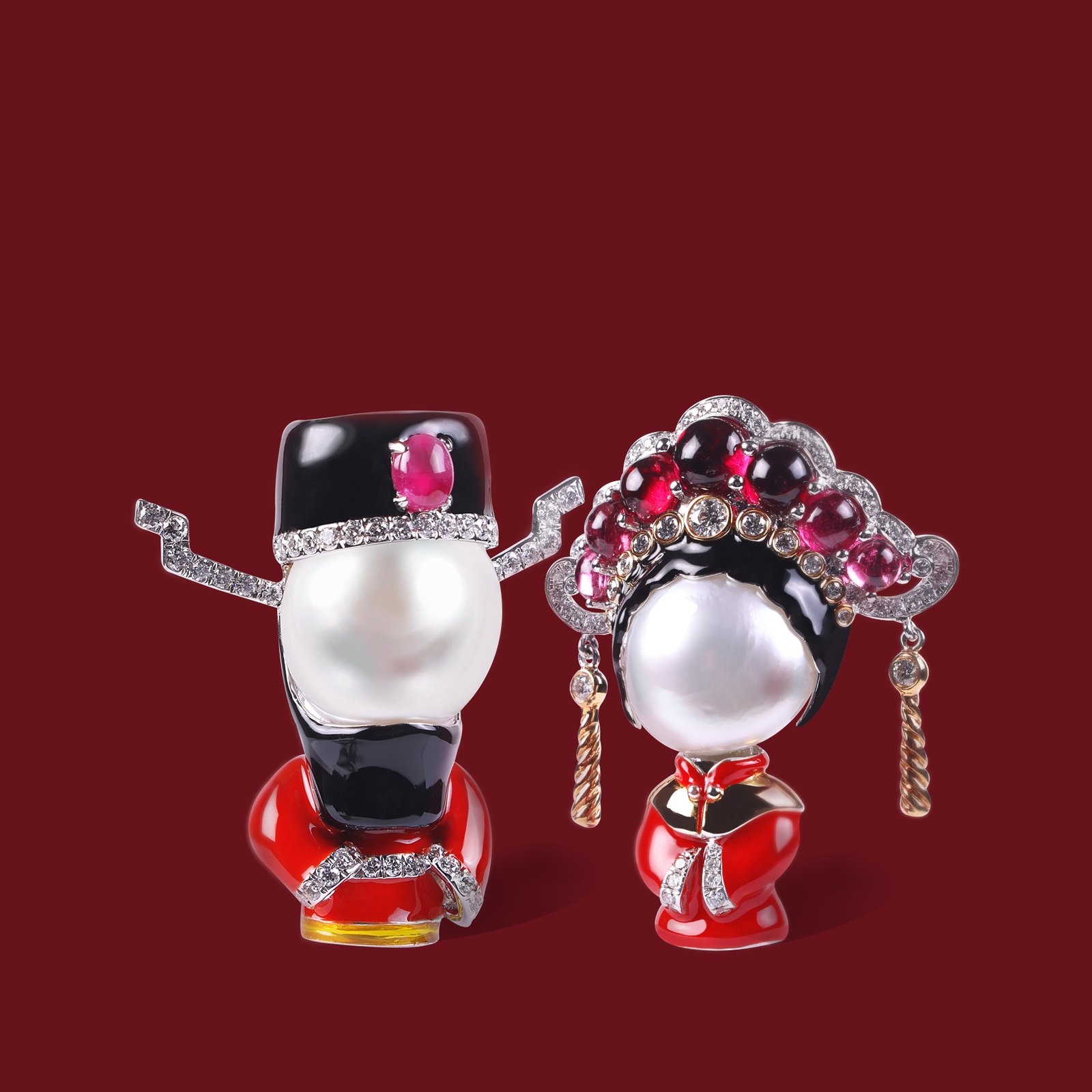 Made of 18K gold and 18K white gold, South Sea Pearl, Enamel, Ruby, and Diamond.