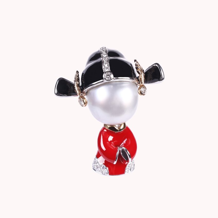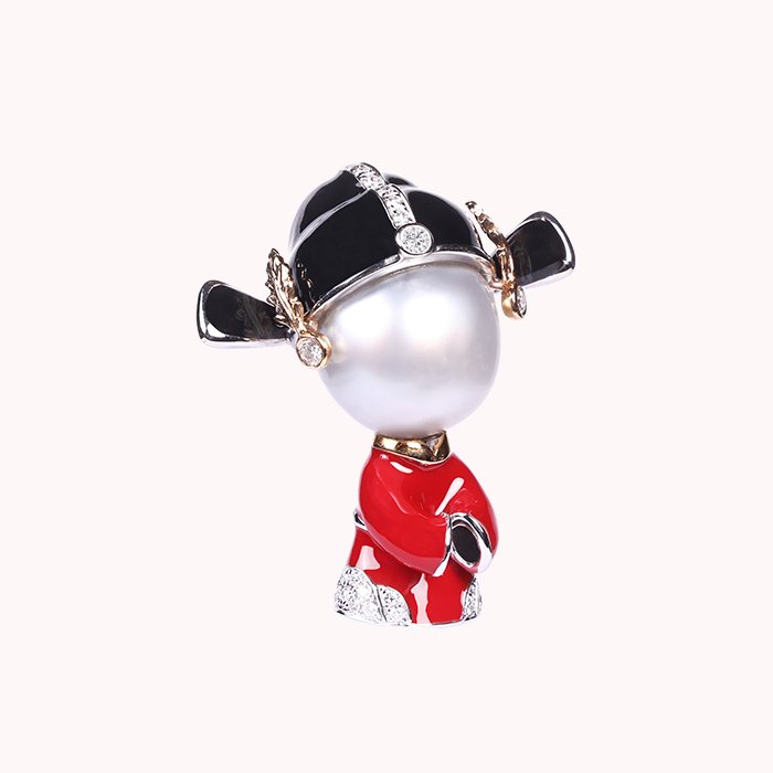 Made of 18K gold and 18K white gold, South Sea Pearl, Enamel, Black Agate, and Diamond.