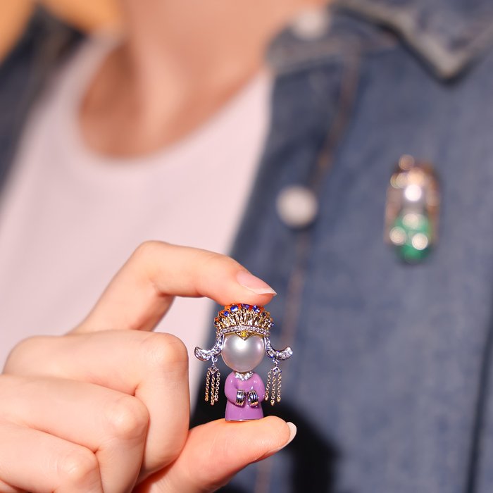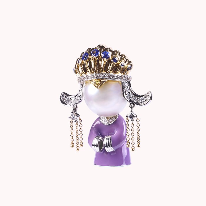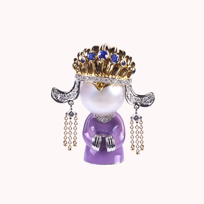 Made of 18K gold and 18K white gold, South Sea Pearl, Mother of Pearl, Enamel, Sapphire, Yellow Diamond, and Diamond.