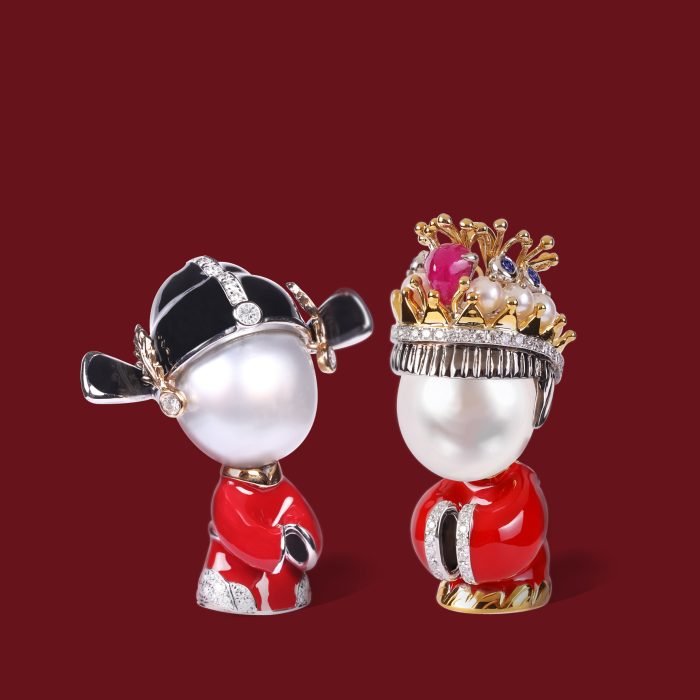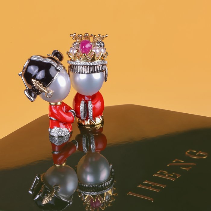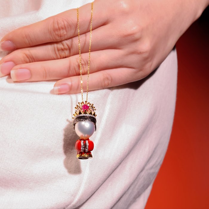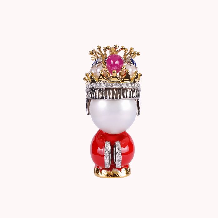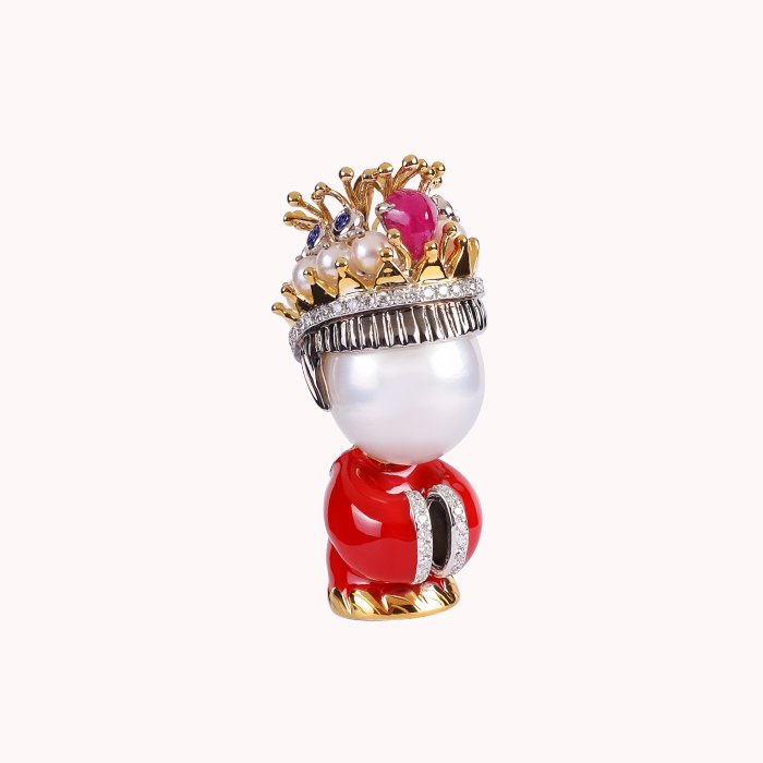 Made of 18K gold and 18K white gold, South Sea Pearl, Japanese pearl, Mother of Pearl, Enamel, Ruby, Sapphire, and Diamond.